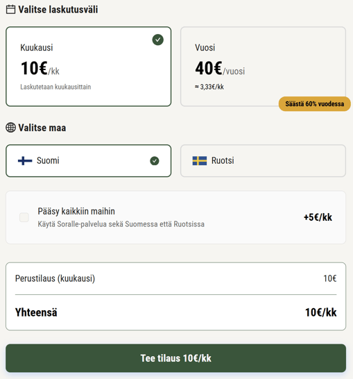 Tämä lisäominaisuus tosiaan veloitetaan maksukortilta välittömästi. Jos sen lisää tilaukseensa kesken nykyisen tilauskauden, niin ensimmäinen maksu on pienempi, joka kattaa vain loppuajan maksukauden loppuun. Jos vaikka on tilannut vuositilauksen puoli vuotta sitten ja tänään lisää siihen kaikki maat (normaalisti 10 euroa/vuosi), niin heti maksettava summa on vain jäljellä olevan kauden eli puolen vuoden hinta, eli 5 euroa. Sen jälkeen lisäominaisuus laskutetaan aina perushinnan yhteydessä, kun kautta jatketaan. Eli tässä esimerkissä puolen vuoden päästä, kun vuositilaus uusiutuu ja siinä on kaikki maat mukana, on lasku 50 euroa (perushinta + 10 euroa kaikista maista).